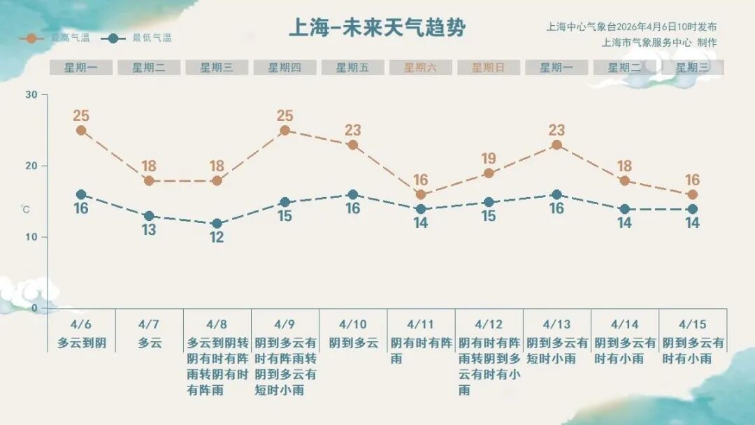 明天是节后首个工作日,多云为主。周三起,西南暖湿气流变得活跃,上海多降雨过程。周四的降水较为明显,气温走高,周四最高气温可达25℃。