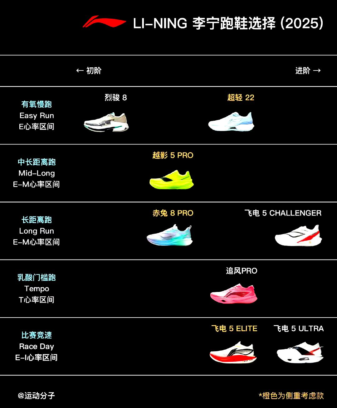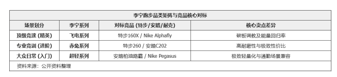 李宁跑鞋已经形成覆盖精英竞速、竞训、大众日常的全场景布局。与竞品相比,李宁更强调“多层级矩阵”,价格相对亲民,覆盖从精英到大众的完整人群。