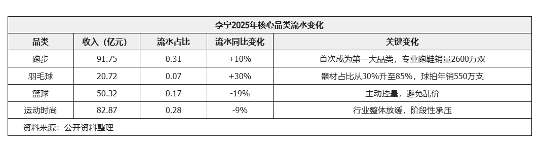 2025年李宁最大的看点,藏在品类结构的变化里。跑步流水同比增长10%,占比首次超过篮球和运动时尚,成为第一大品类;羽毛球收入增长30%,更关键的是结构变了——球拍、球线等核心器材的占比从三四年前的30%左右,一举提升到85%。与此同时,篮球流水下滑19%,运动时尚下滑9%。