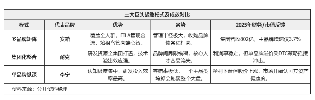 例如,安踏走的是多品牌矩阵路线,通过收购、合资,再加上主品牌安踏和FILA,形成覆盖大众到高端、专业到时尚的品牌梯队;耐克走的是集团整合路线,将不同子品牌的创新、设计与产品团队深度整合,构建统一的创新引擎,技术可以在不同品牌之间流动。