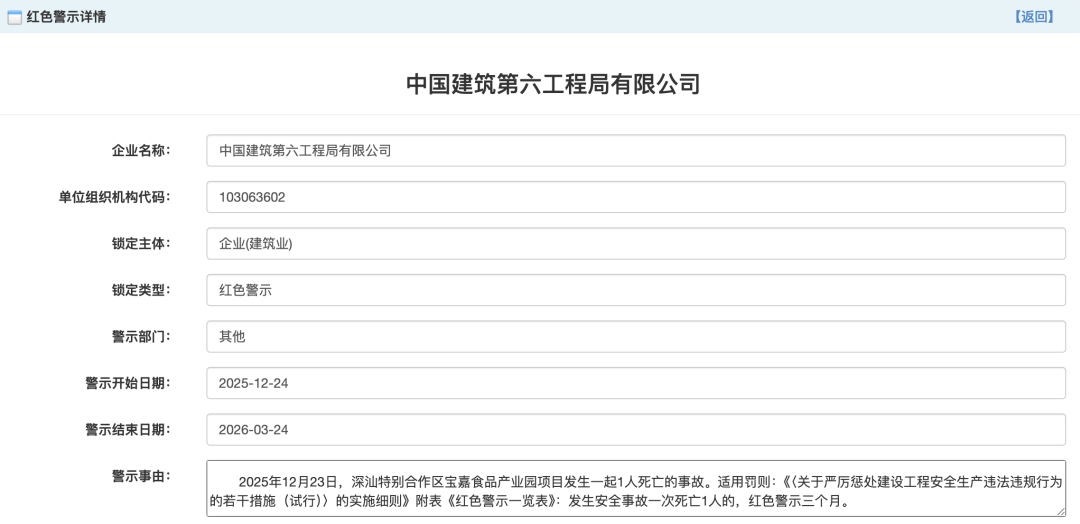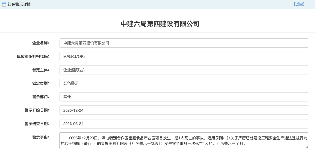 中建六局第四建设有限公司及其母公司中国建筑第六工程局有限公司,因关联宝嘉食品产业园项目生产安全事故,被深圳市住建局予以红色警示3个月。警示期自2025年12月24日起至2026年3月24日止。