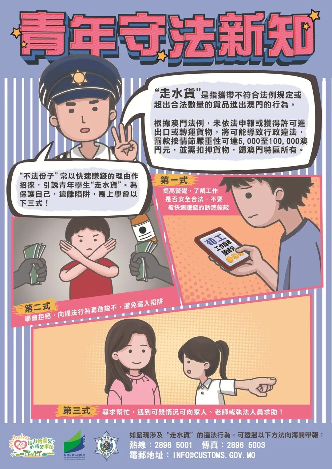 针对学生违法“走水货”等高发风险问题,教青局持续与海关定期入校开展普法讲座,透过法律讲解与真实案例分析,向学生清晰说明“走水货”对个人的严重影响,强化其拒绝被利用的自觉能力,确立坚守守法底线、远离违法行为的价值观。同时,因应清明及复活节等长假期,教青局联同海关共同在关闸口岸开展宣传教育活动,藉以向青少年及家长宣教“走水货”需负担的个人责任和严重后果。