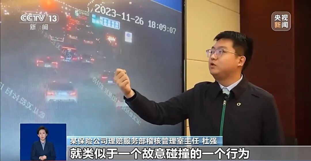 某保险公司理赔服务部稽核管理室主任 杜强:这是涉事的当事车辆,这是我们所承保的一个标的车辆。在行驶过程中,涉事的嫌疑车辆并没有任何刹车动作,然后我们标的车辆向内并道的时候,涉事车辆直接往前进行一个剐蹭,就类似于一个故意碰撞的行为,造成了这个事故的发生。
