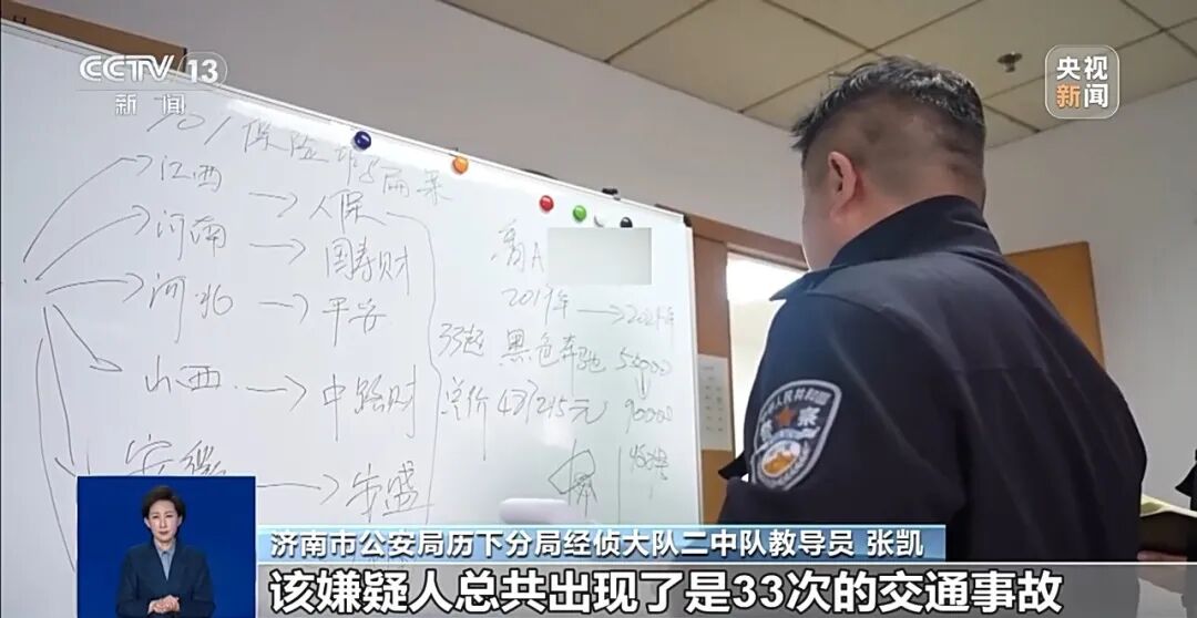 济南市公安局历下分局经侦大队二中队教导员 张凯:自2019年至2024年初,该嫌疑人总共出现了33次的交通事故,全部都是对方全责,而其本人无责。针对这种情况,我们与交警部门进行了联合分析。