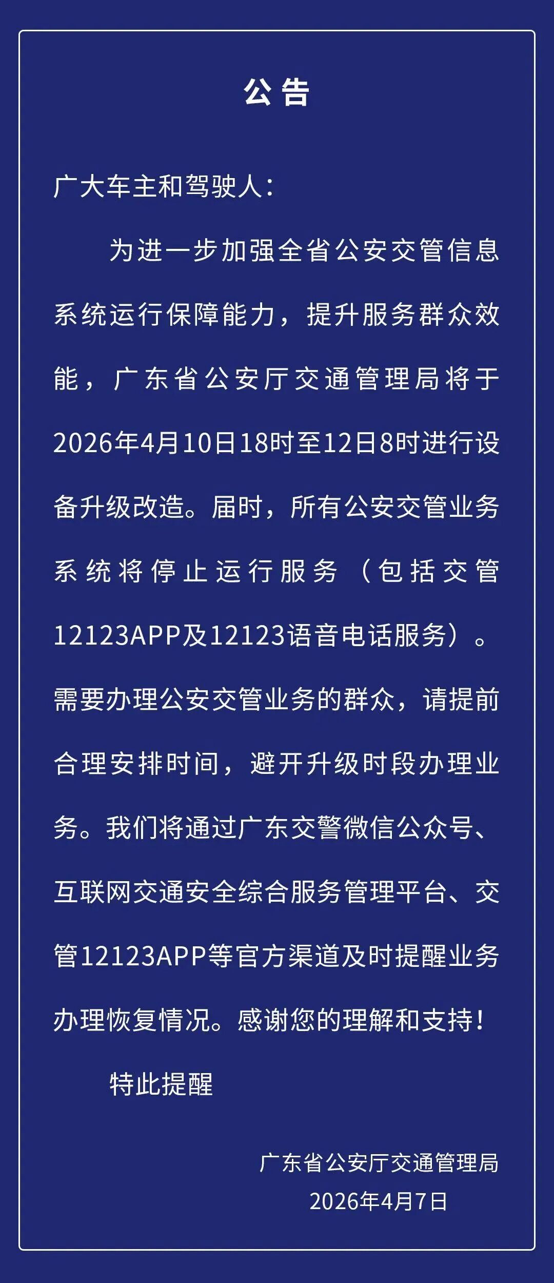 4月7日,广东省公安厅交通管理局发布通告,为进一步加强全省公安交管信息系统运行保障能力,提升服务群众效能,定于2026年4月10日18时至4月12日8时开展系统设备升级改造工作。