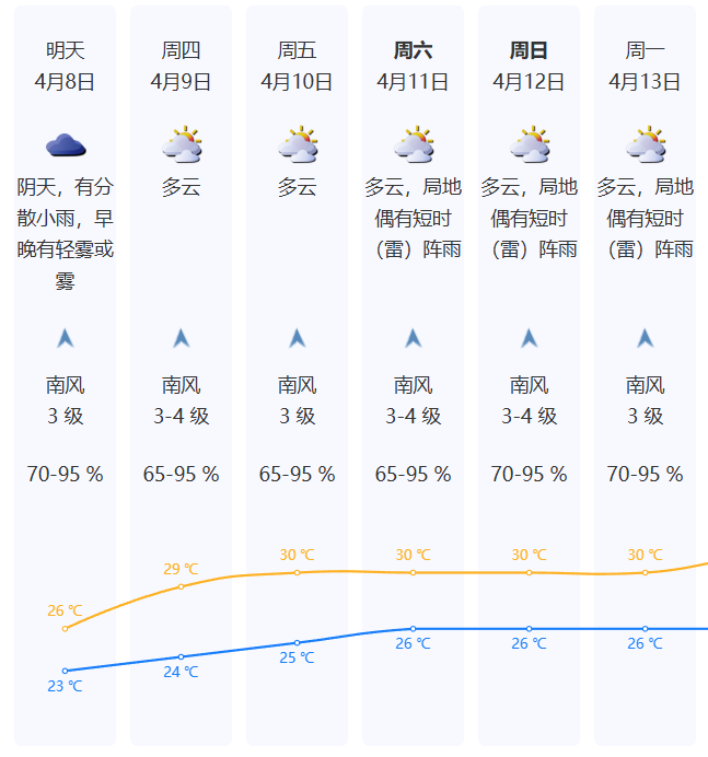 8日受弱冷空气影响,阴天,有分散小雨,早晚有轻雾或雾,最大阵风7级左右,气温23-26℃;