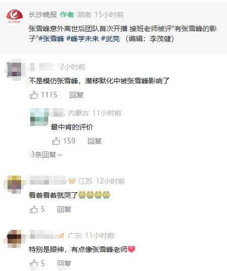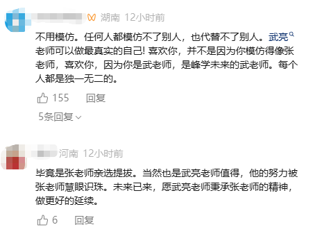 有网友说:“不是模仿张雪峰,潜移默化中被张雪峰影响了” “特别是眼神,有点像张雪峰老师“,也有网友表示:“不用模仿,任何人都模仿不了别人,也代替不了别人。武亮老师可以做最真实的自己! 喜欢你,并不是因为你模仿得像张老师,喜欢你,因为你是武老师,是峰学未来的武老师。每个人都是独一无二的”。