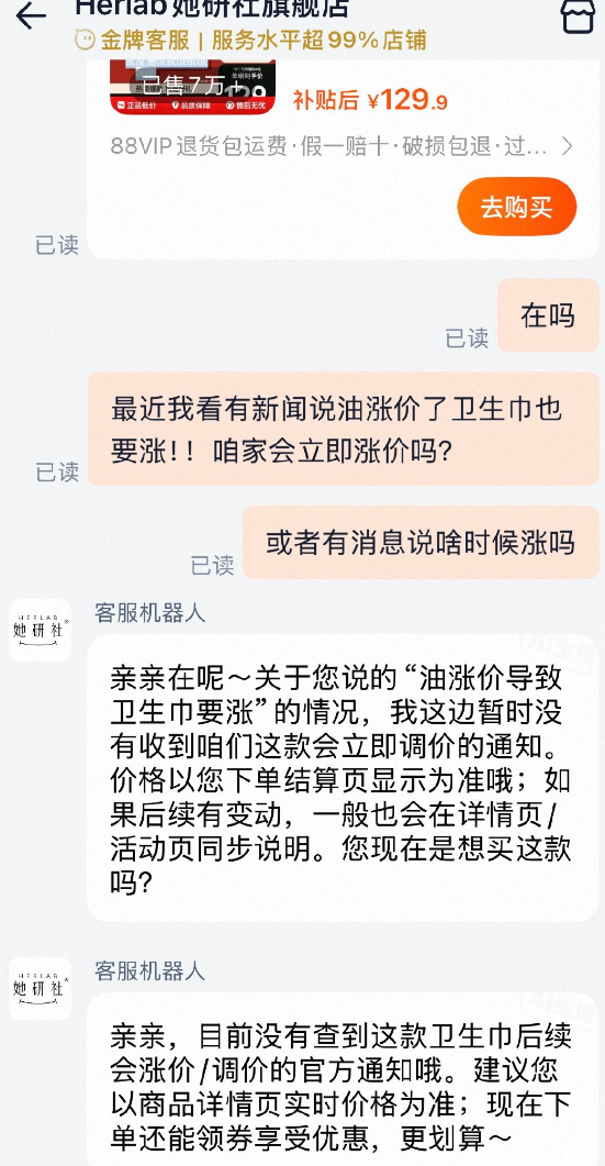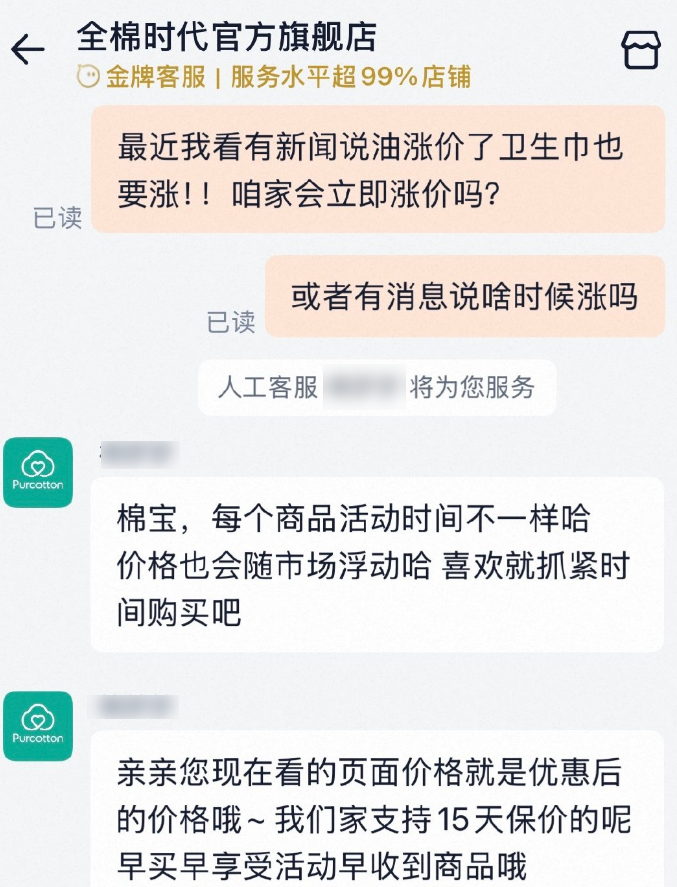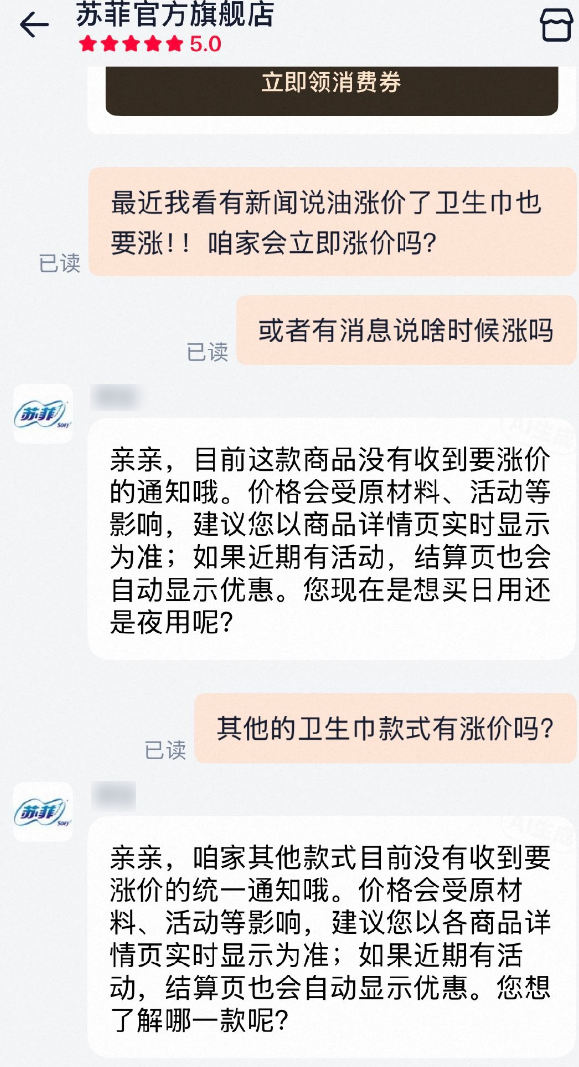 4月7日,针对卫生巾是否会立即涨价的问题,记者以消费者的身份咨询高洁丝、全棉时代、她研社、苏菲等卫生巾品牌客服。