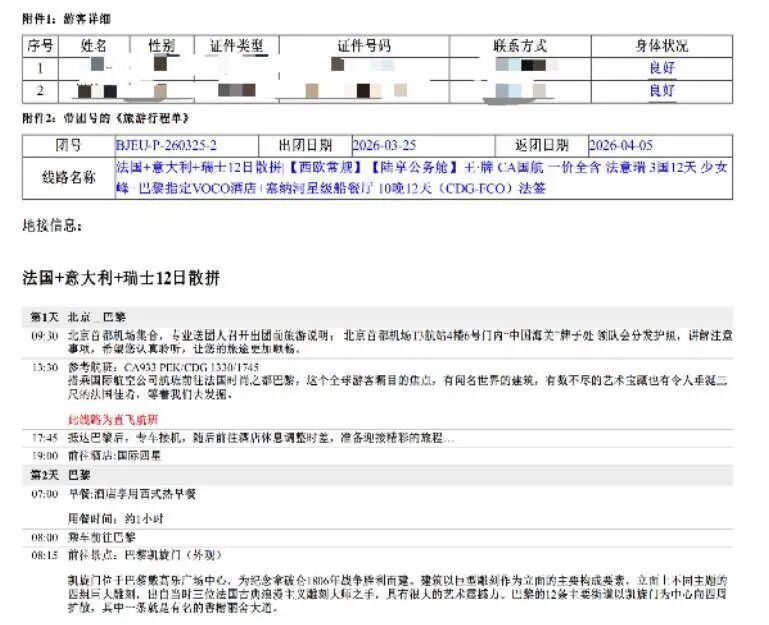 据发帖人小新介绍,该旅行团由竹园国际旅行社组织,于3月25日从北京出发,4月5日返回,全程12天,游览法国、瑞士、意大利等国家,团员共28人。