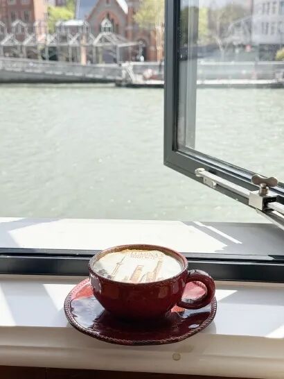 游客冯橙宇则对窗边的打卡位情有独钟,“在这里静坐片刻,点一杯咖啡,看看河面的游船与沿岸的老建筑,那种舒缓、松弛的节奏,确实能唤起类似塞纳河畔的悠闲惬意。还有窗前的几盏灯太有氛围感了,如果是傍晚蓝调时刻,光影落在河面上,再搭配岸边的建筑,拍出来的照片更加出片好看。”