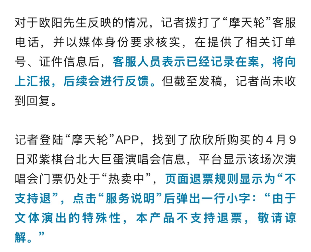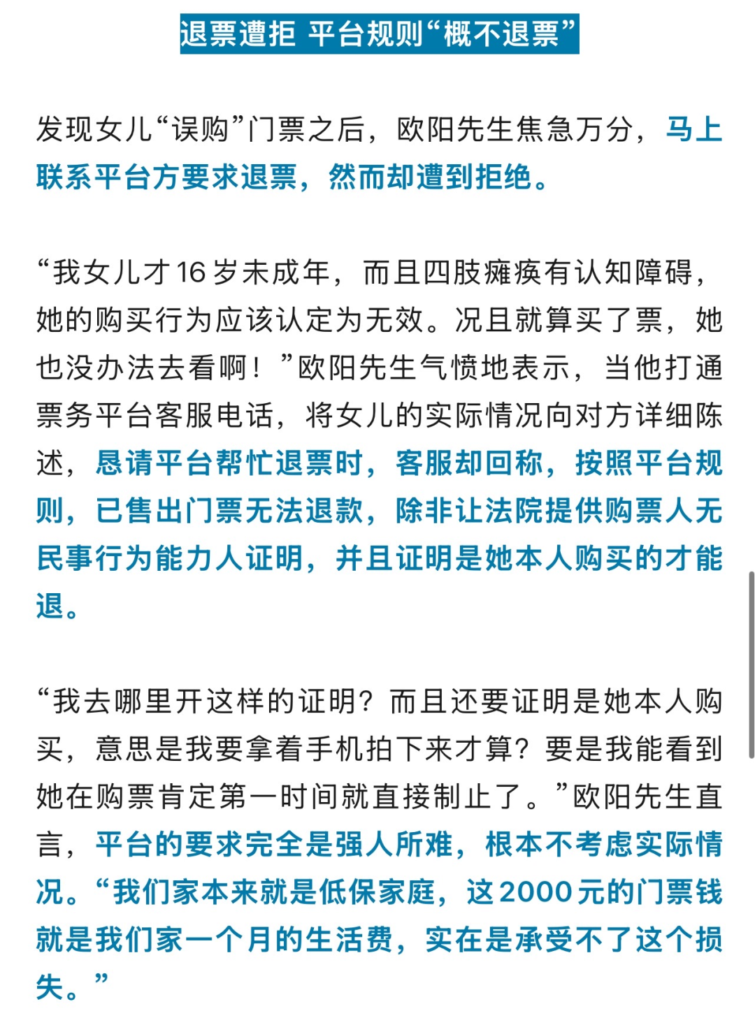 欧阳先生来电向“新民帮侬忙”求助,自己16岁的女儿欣欣瘫痪在床,且存在认知障碍,因一时“手误”在摩天轮预订了一张2000多元的演唱会门票,自己发现后马上申请退票,结果平台却称演唱会门票售出不退,除非让法院提供无民事行为能力人证明。“我们本来就是低保家庭生活困难,女儿也根本无法去听演唱会,这笔开支实在是让我们难以承受。”欧阳先生语气中带着哽咽和颤抖。