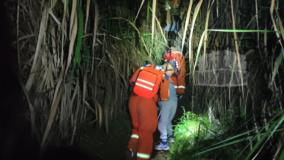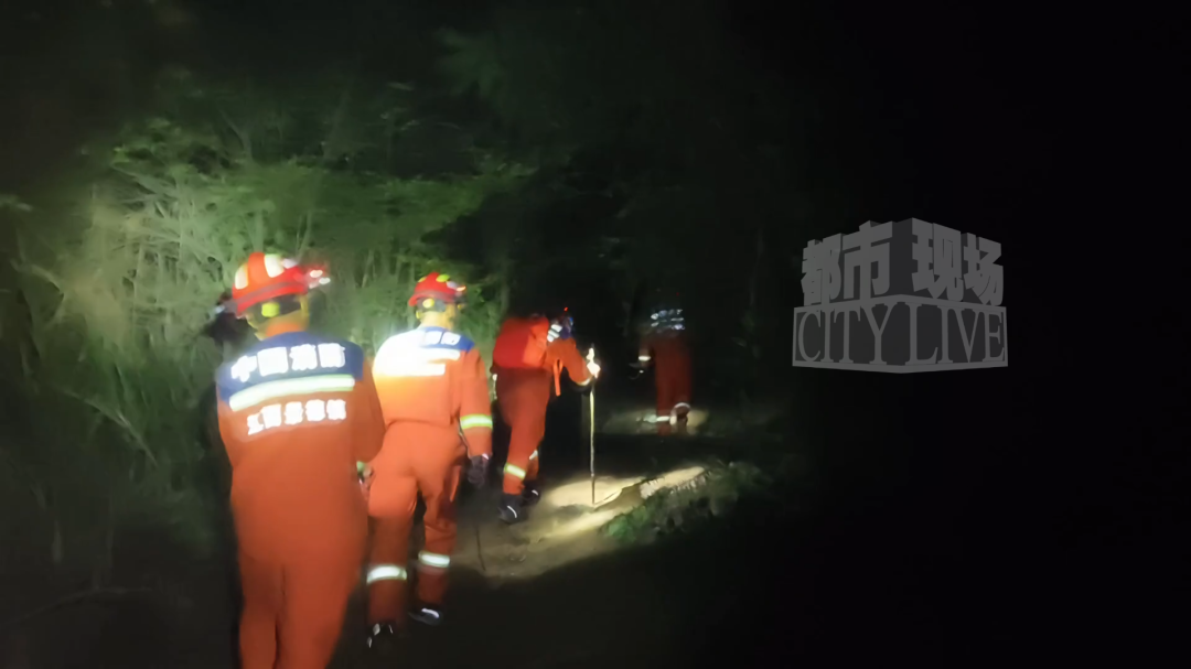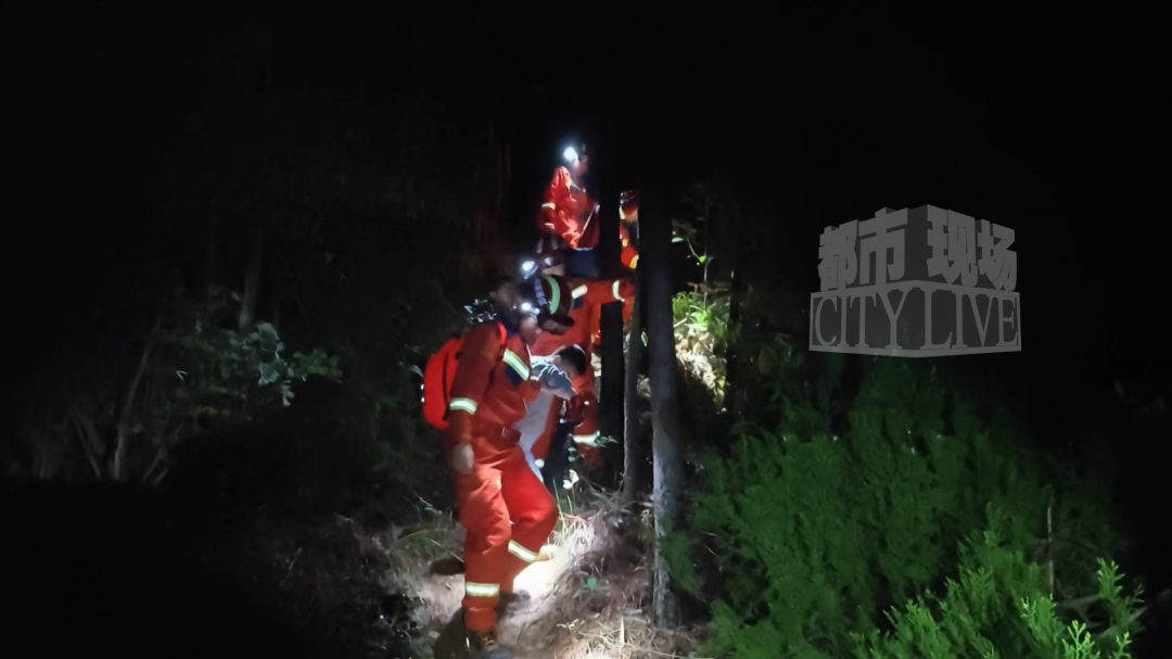 当晚7点多,消防救援人员抵达山脚。由于天色已暗,救援难度增加。在出警途中,消防员通过与被困男子电话沟通,引导他对周边的路标和明显标志物体进行拍摄,以此确认大致方位。