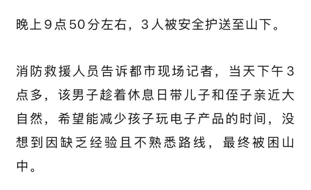 原地休整后,消防救援人员将两名小孩护在身旁,一路小心翼翼地引导他们下山。