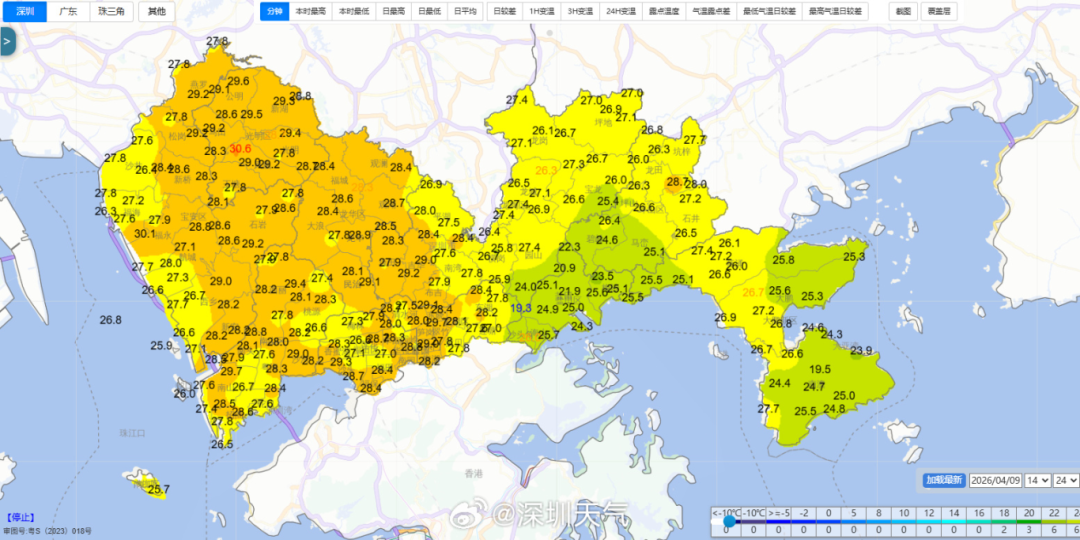 9日,韶关、清远、粤西沿海、珠江三角洲西部市县阴天到多云,有分散阵雨,其余市县多云间阴天,早晚有轻雾或雾。白天最高气温:雷州半岛34~36℃,肇庆、云浮、茂名北部、佛山市县30~33℃,其余市县27~30℃。