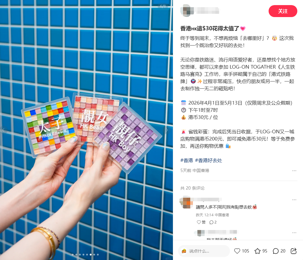 近日,香港又多了一个新的打卡机位。位于又一城的LOG-ON的“自制”港铁马赛克磁石火了,不少市民在开门前一个钟到场排队,花费30元即可自选马赛克颜色、字样,砌出专属磁石。