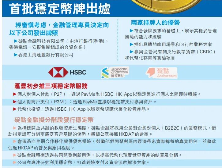 至于另一家获发稳定币牌照的汇丰银行,其将以下半年推出港元稳定币为目标,并接入旗下PayMe及香港汇丰流动理财应用程式。汇丰PayMe主管李冠康表示,将按法规调整旗下合资格使用人士安排。