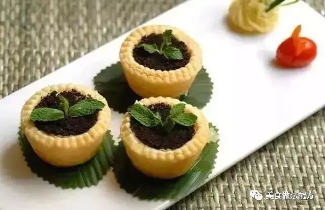2、将杏仁汁、白糖、鸡蛋拌匀成浆,倒入挞盏中,入烤箱以上火220℃、下火150℃烤15分钟,取出,撒朱古力粉,用薄荷叶装饰即可。