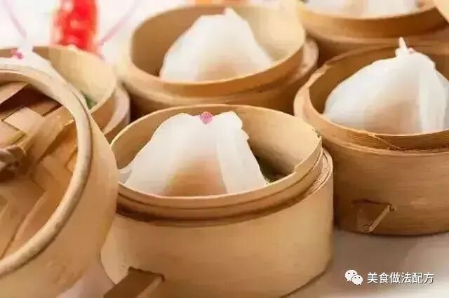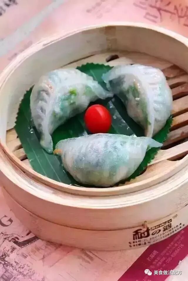 原料:斑节虾,蟹黄,冬笋粒,肥肉粒,油菜叶,澄面,樱桃粒,生抽,盐,生粉。