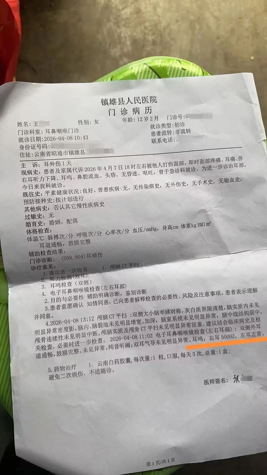 4月10日,云南昭通镇雄县的王先生反映称,他女儿王童(化名)在当地一所名为“蓄菁学校”的私立学校读六年级。7日晚,因女儿给该校一老师起外号,被这名老师扇了四耳光,“当时就打流鼻血了,之后她说头晕耳鸣,第二天到医院检查,医生诊断为耳损伤。”