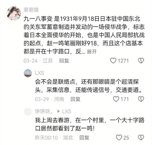 据抖音黑板报转发的网帖,相关谣言在短视频评论区传播较广,形式多样。有的将品牌名称“赵一鸣”与历史事件进行荒诞关联和影射;有的无端猜测其开设在十字路口的店铺为“信息传送点”或“联络点”;更有甚者,在品牌卡通形象上做文章,称其“眼睛会转圈”是“超清探头”。