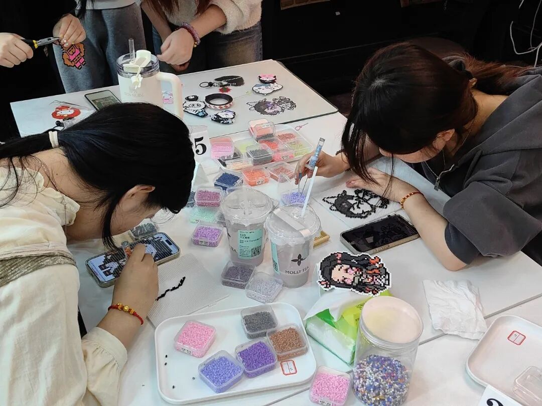 威威所在的宿舍,在大家都没课时,她们桌上常年摊着豆板、镊子、收纳盒和一袋袋不同色号的豆子,谁先拼完轮廓,谁就把位置让出来。有人负责找图纸,有人负责摆色块,有人擅长前期对着图案一点点往上排,威威则逐渐成了最后收尾烫豆的那个人。