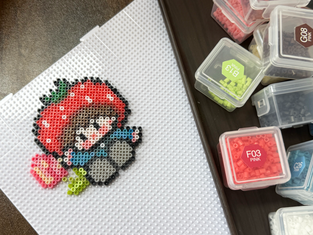 对小热来说,拼豆最珍贵的地方,恰恰在这里,它不像工业流水线上的商品那样标准、整齐,却因为花掉了几小时的时间和心思,反而更像一种能被随身携带的关系凭证。朋友之间会互相送,也会收到后再做一个送回去,久而久之,作品在彼此手中来来回回,感情也就跟着一点点加深。