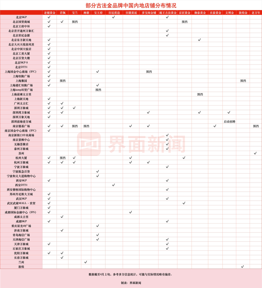 据界面新闻统计,截至4月上旬,老铺黄金在中国内地进驻了32家商场。这些商场中至少有19家都同时引入了其他古法金品牌。