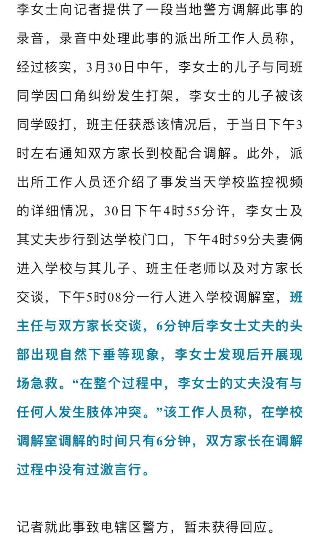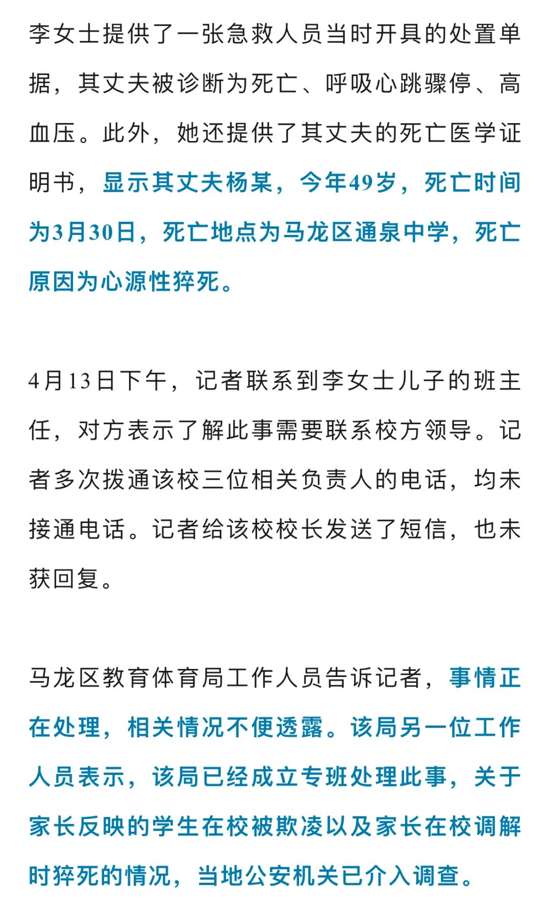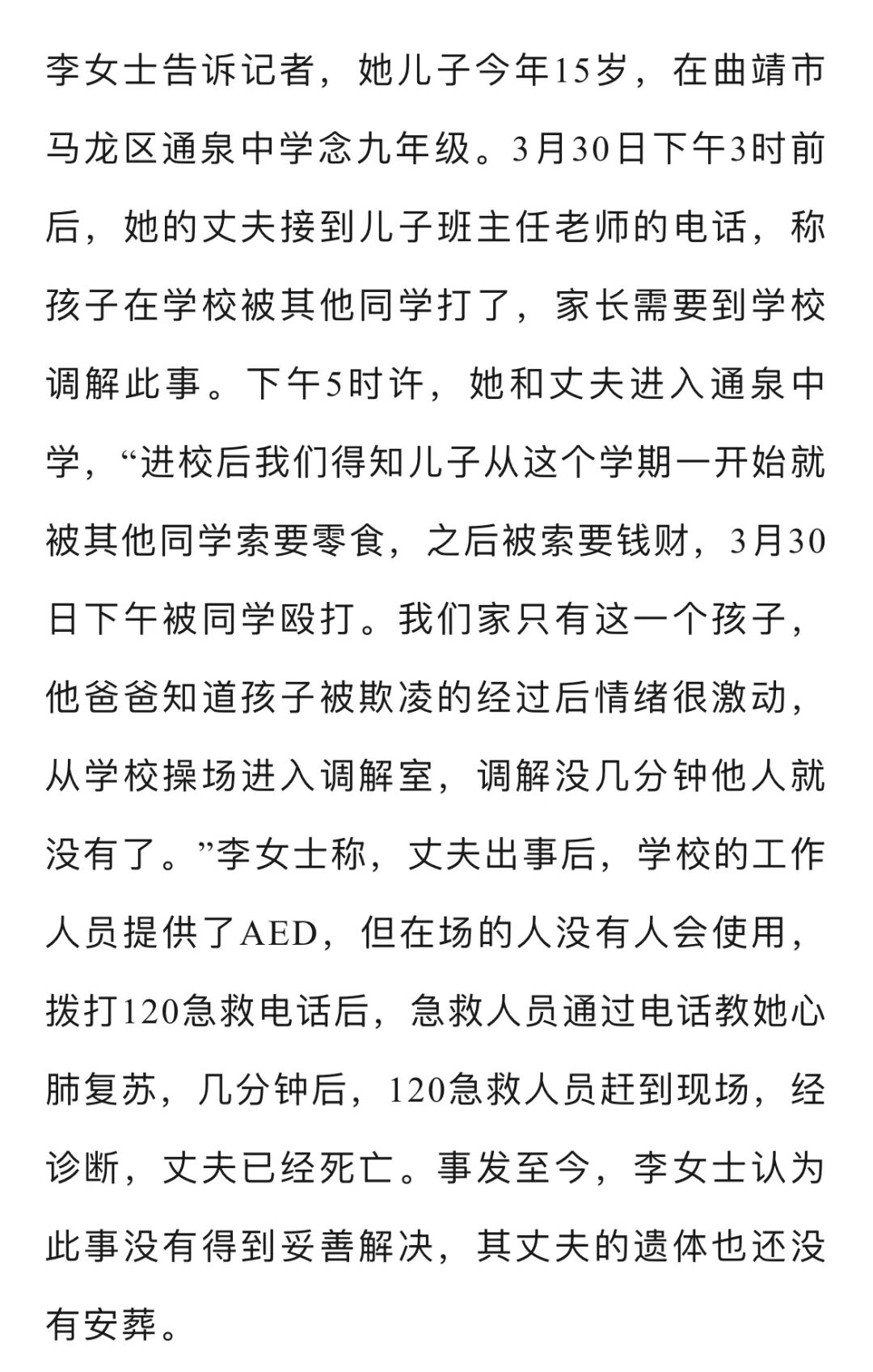 4月13日,云南曲靖的李女士报料称,3月30日下午,她的丈夫接到孩子班主任老师的电话,称孩子在学校被其他同学殴打,需要家长到学校调解,到学校后,丈夫得知了孩子被其他学生欺凌的经过,在学校调解室因情绪激动当场猝死,目前丈夫还未安葬。对此,曲靖市马龙区教育体育局工作人员回应记者,该局已成立工作专班处理此事,关于家属反映的情况,当地警方正在调查。