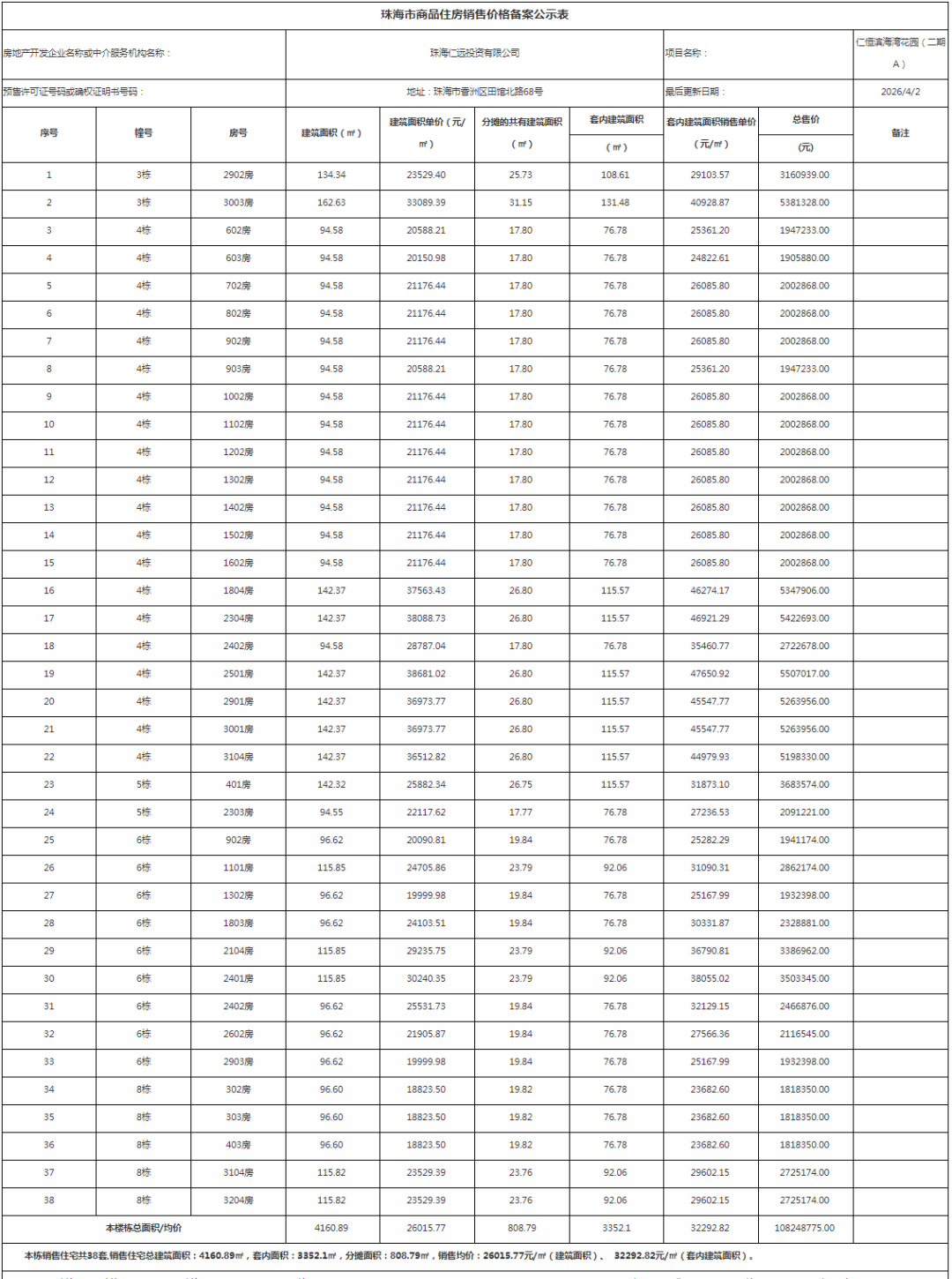 在本次公示的价格备案中,香洲区共有6个项目商品房价格备案公示,累计公示166套可销售住宅单位,备案均价约2.3-3.8万元/㎡。