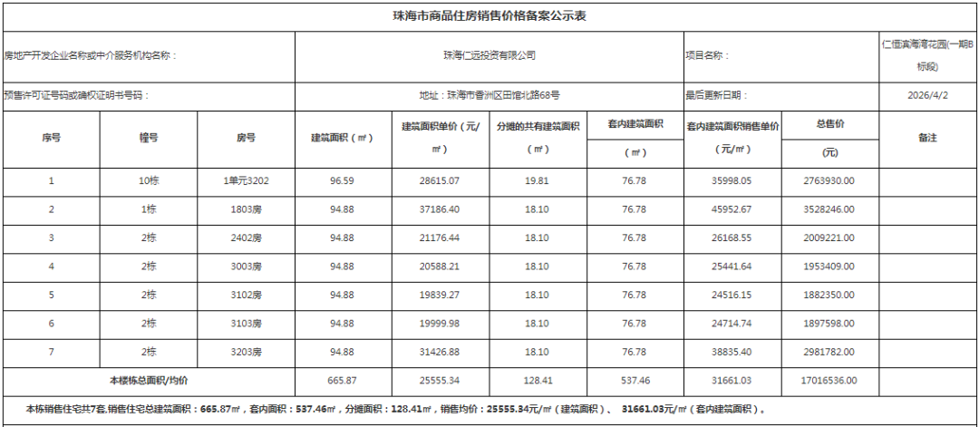在本次公示的价格备案中,金湾区共有3个项目商品房价格备案公示,累计公示113套可销售住宅单位,备案均价约0.92-1.8万元/㎡。