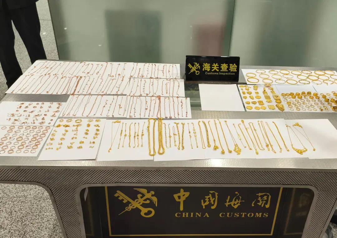 据深圳海关缉私局介绍,2025年3月,深圳宝安机场海关在对一趟深圳出境航班进行行李查验时,发现楼某、李某等3名旅客未向海关申报,在随身行李和托运行李中夹带手镯、戒指等黄金饰品近400件,总重达2.8千克,明显超出合理自用范围。面对询问,相关3人回答前后矛盾,疑点重重,海关立即将线索通报机场海关缉私分局。
