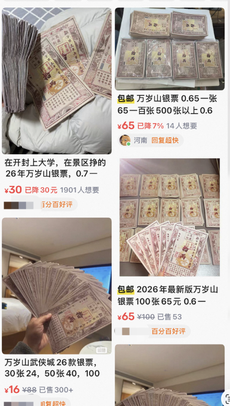 4月13日,记者注意到,在二手交易平台以“万岁山”“银票”等关键词检索发现,不少网店以36元100张的价格批量售卖类似商品。