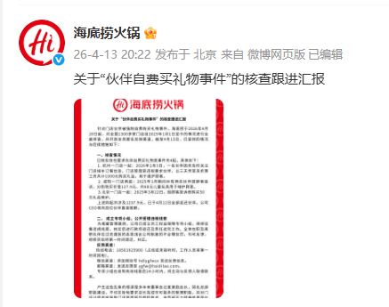 摘要: 4月13日,@海底捞火锅 发布《关于“伙伴自费买礼物事件”的核查跟进汇报》:针对门店伙伴被强制自费购买礼物事件,海底捞于2026年4月10日起,对全国1300多家门店自2025年1月1日至今的情况进行全面排查,并开放全员匿 ...