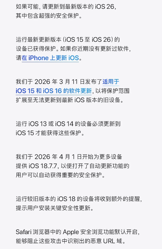 4月15日,苹果官微发文表示,安全研究人员最近发现,存在一些基于网页的攻击,它们会借助恶意网页内容,对过时版本的iOS发起攻击。