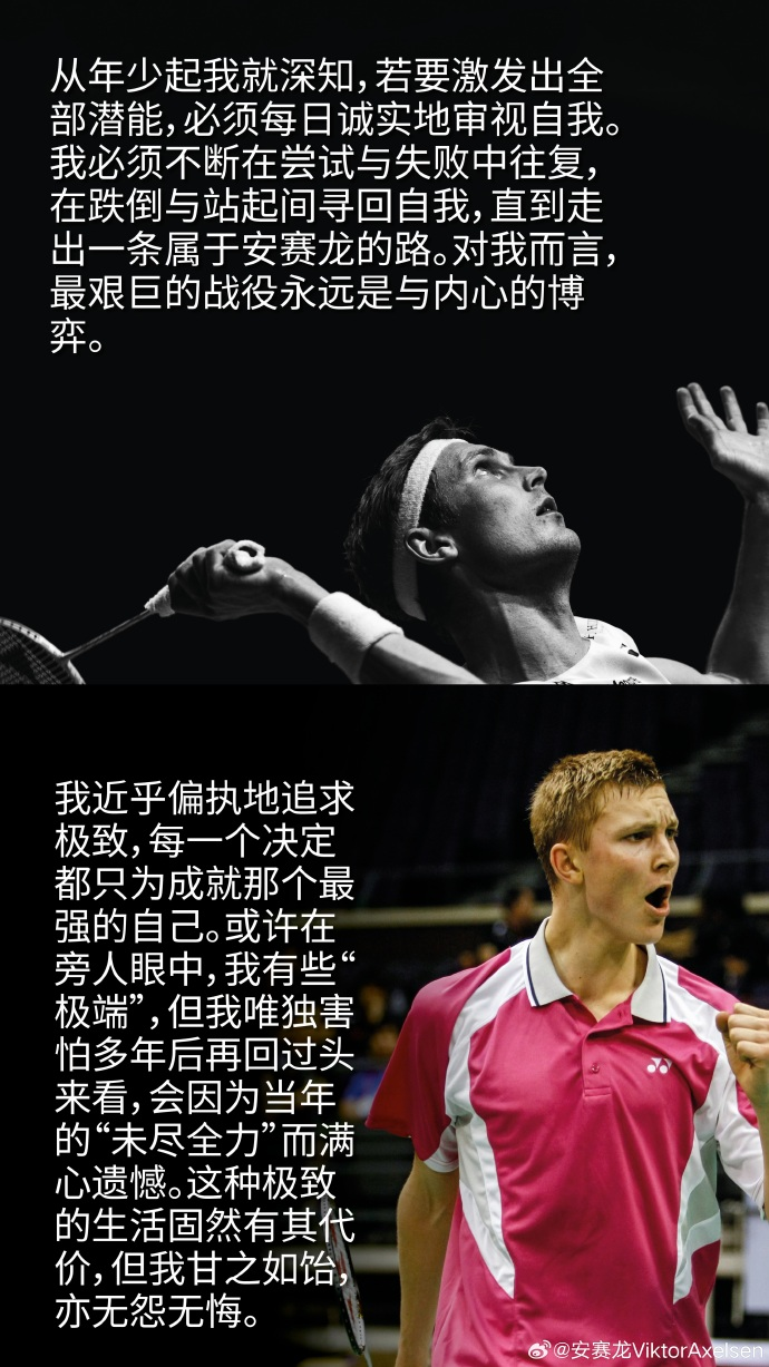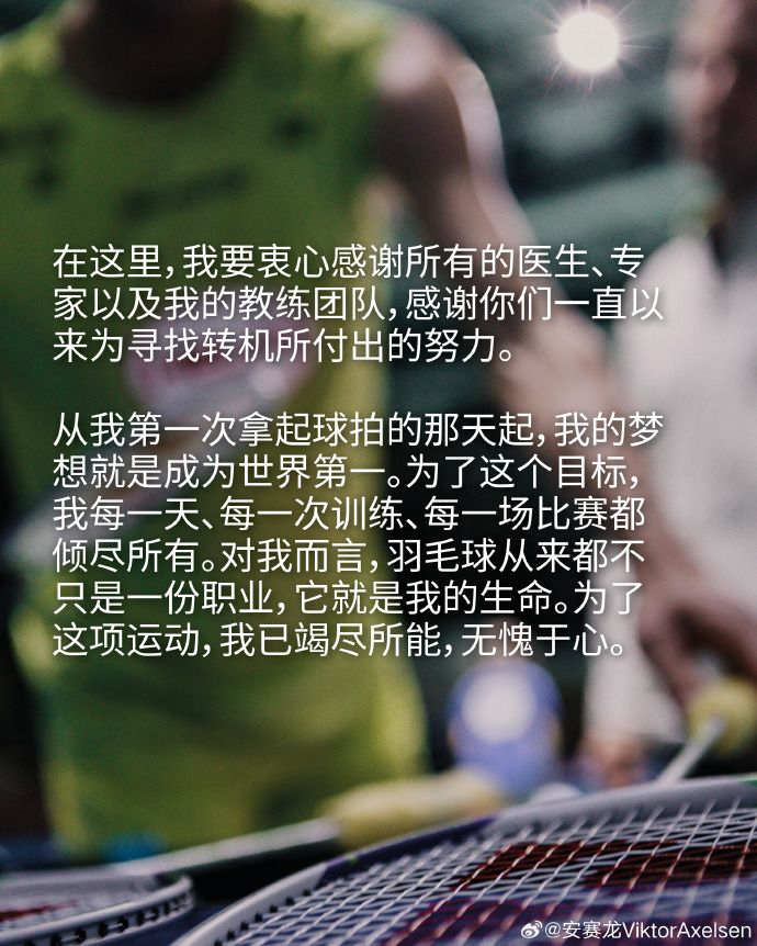 从我第一次拿起球拍的那天起,我的梦想就是成为世界第一。为了这个目标,我每一天、每一次训练、每一场比赛都倾尽所有。对我而言,羽毛球从来都不只是一份职业,它就是我的生命。为了这项运动,我已竭尽所能,无愧于心。” 安赛龙于1994年1月4日出生,曾获得2020年、2024年两届奥运会羽毛球男单冠军,战胜过林丹、谌龙等中国名将。