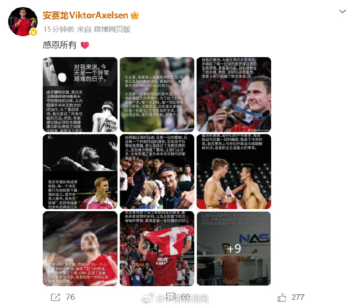 据中国新闻网,4月15日,丹麦羽毛球运动员安赛龙宣布退役。安赛龙表示:“对我来说,今天是一个异常艰难的日子。由于腰伤反复,我已无法再继续维持最高水平的竞技和训练。从内窥镜手术到无数次封闭治疗,为了重回球场,我已尝试了所有可能的方法。然而,专家建议我必须在长期健康与职业竞技之间做出取舍。接受这个现实对我来说无比艰难,但我的身体发出了最后的信号,它已无法支撑我继续征战。