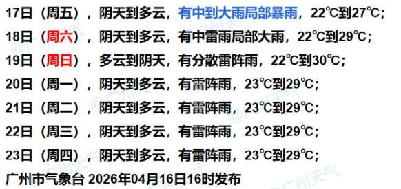 广东省气象台预计,4月17日白天到夜间,韶关南部、清远南部、河源北部、珠三角大部和粤西市县阴天有中到大雨局部暴雨,广东其余市县有雷阵雨局部大雨,上述地区雷雨时局地伴有8级左右的短时大风。