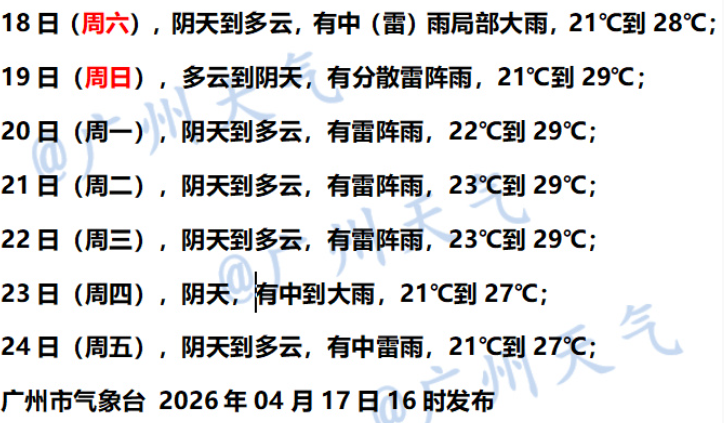 广州市气象台预计,4月18日白天—19日雷雨减弱,以分散雷阵雨为主。20日受南风辐合影响,广州雷雨增多。