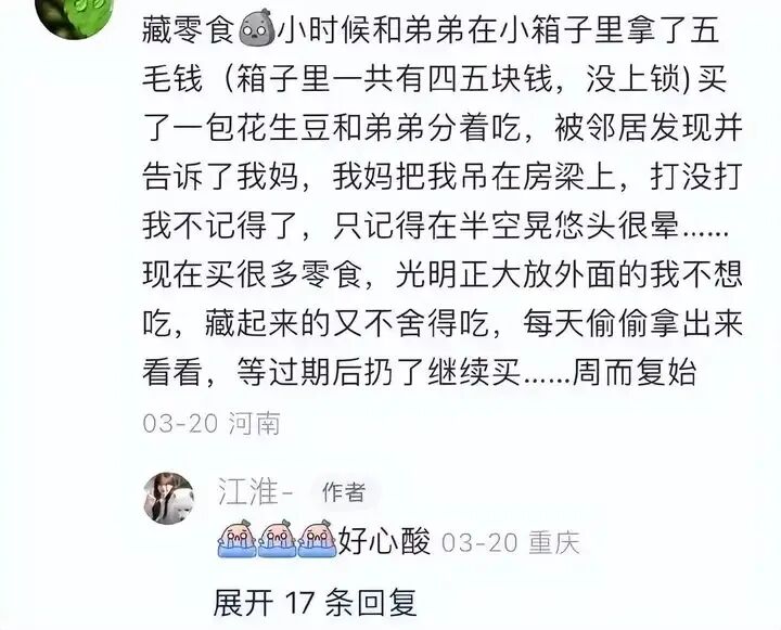 还有人童年时,因为拿5毛钱买了一包花生豆和弟弟分着吃,被妈妈吊在房梁上惩罚。