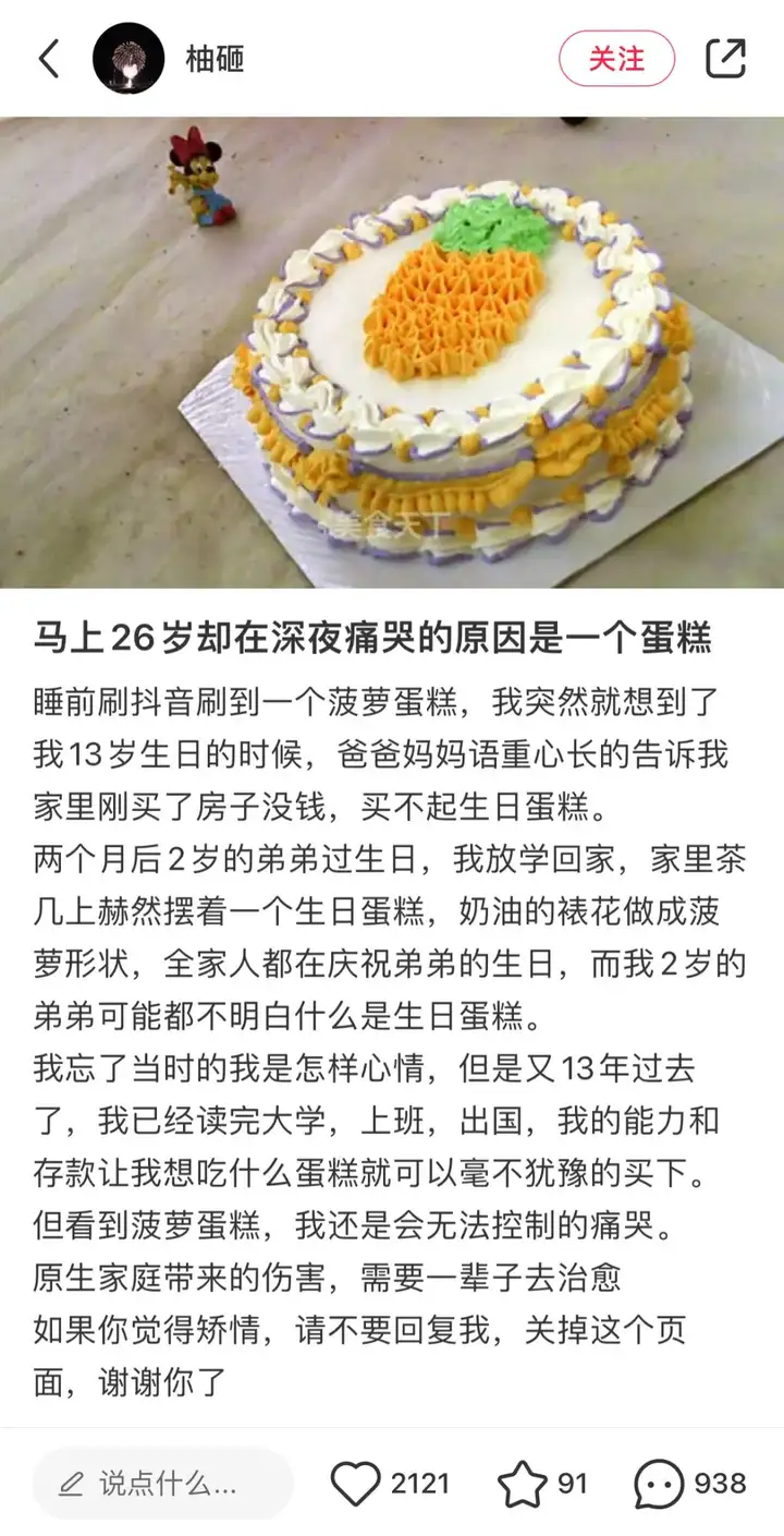 说一个女生,睡前玩手机的时候,刷到了一个菠萝蛋糕,这让她回想起了自己的13岁生日。