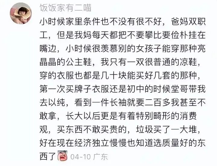 长大以后,她就形成了特别畸形的消费观,买东西不敢买贵的,垃圾买了一大堆。