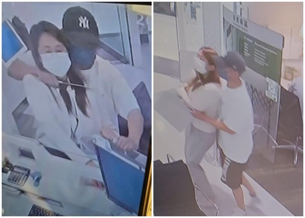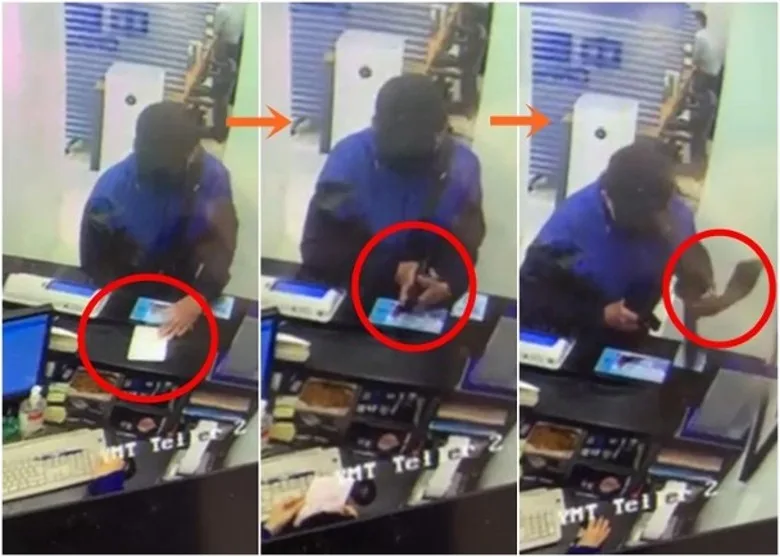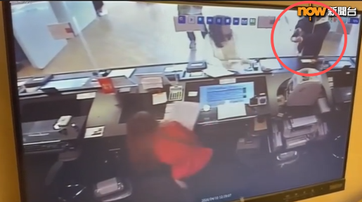 没过多久,一名身穿黑色外套、戴着鸭舌帽和口罩的男子突然闯进银行,二话不说就拔出一只疑似手枪的物品,左手还拿着一把锤子,直指女职员进行恐吓。