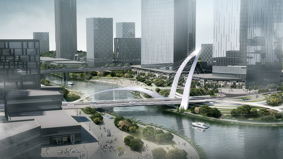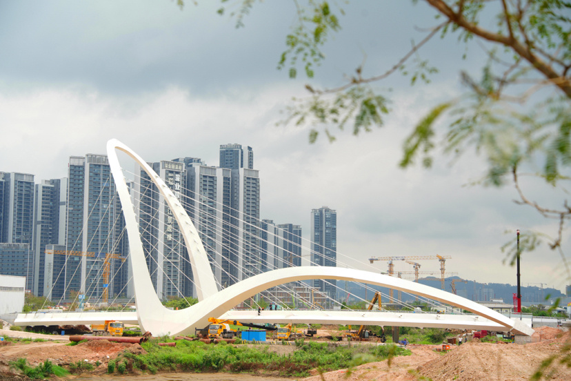 中轴涌4号桥作为B208路跨中轴涌的重要交通枢纽,全长107.5米、宽16米,共设计安装26根斜拉索,分为13对,对称分布于桥塔两侧,是横沥岛尖“一桥一景”规划的关键节点,采用主梁与拱塔组合的结构形式,以椭圆形拱塔搭配单拱,通过异形变化空间曲面结构,生动诠释“双鳍逐浪”的设计理念。