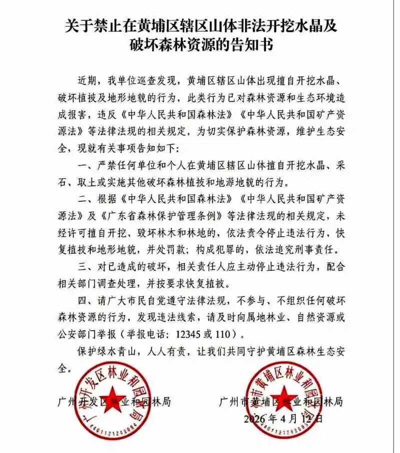 4月12日,广州开发区、黄埔区林业和园林局联合发布告知书,明确指出巡查发现黄埔区辖区山体出现擅自开挖水晶、破坏植被及地形地貌的行为,已对森林资源和生态环境造成损害,违反《中华人民共和国森林法》《中华人民共和国矿产资源法》等法律法规。