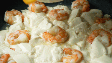 2、锅中刷一层油,放入1块内酯豆腐,用铲子切成小块。再铺上虾仁。