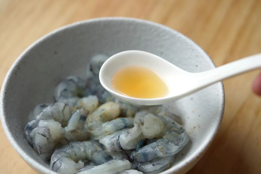 1、120g虾仁放入1/2勺料酒,1/8勺白胡椒粉,1/8勺盐抓匀腌制10分钟。