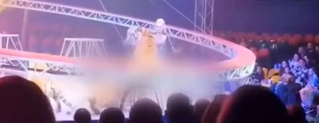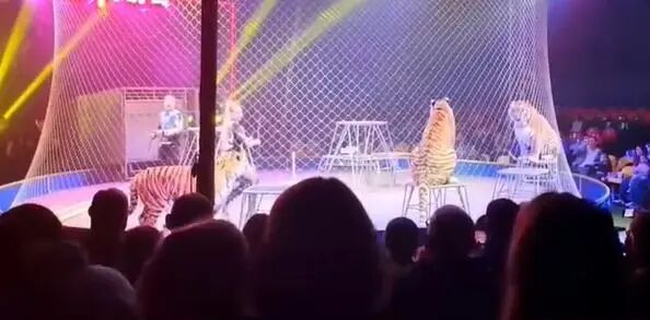 一只老虎跳出舞台跑进观众席,俄罗斯马戏团驯兽师将其“捉拿”回笼 ...