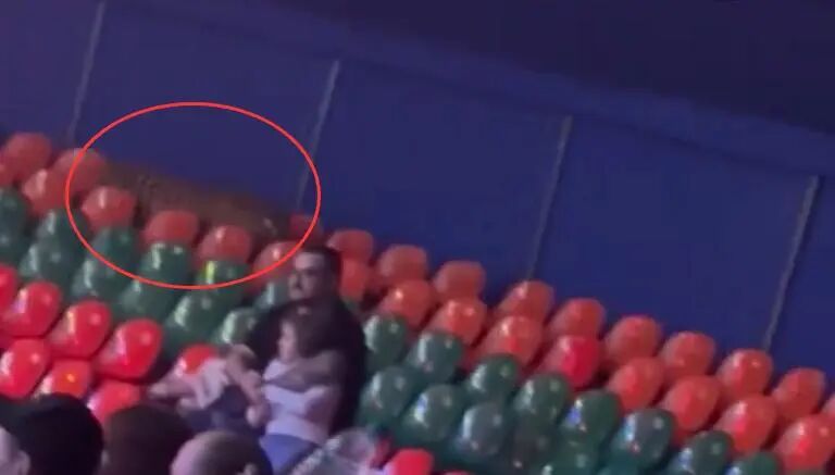 从视频中可见,三只老虎在舞台上表演,原本围住舞台的安全防护网突然坍塌滑落,其中一只老虎一纵身,轻松跃过安全网,跳进了观众席。现场一片惊呼声,观众吓得站起身,成年人赶紧用身体护住孩子。