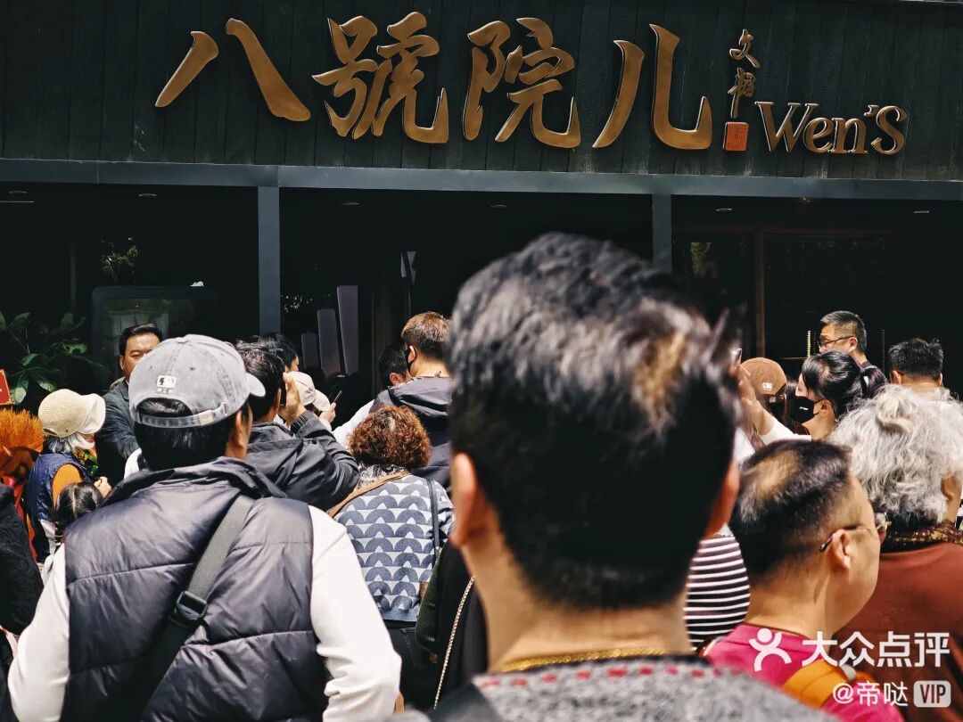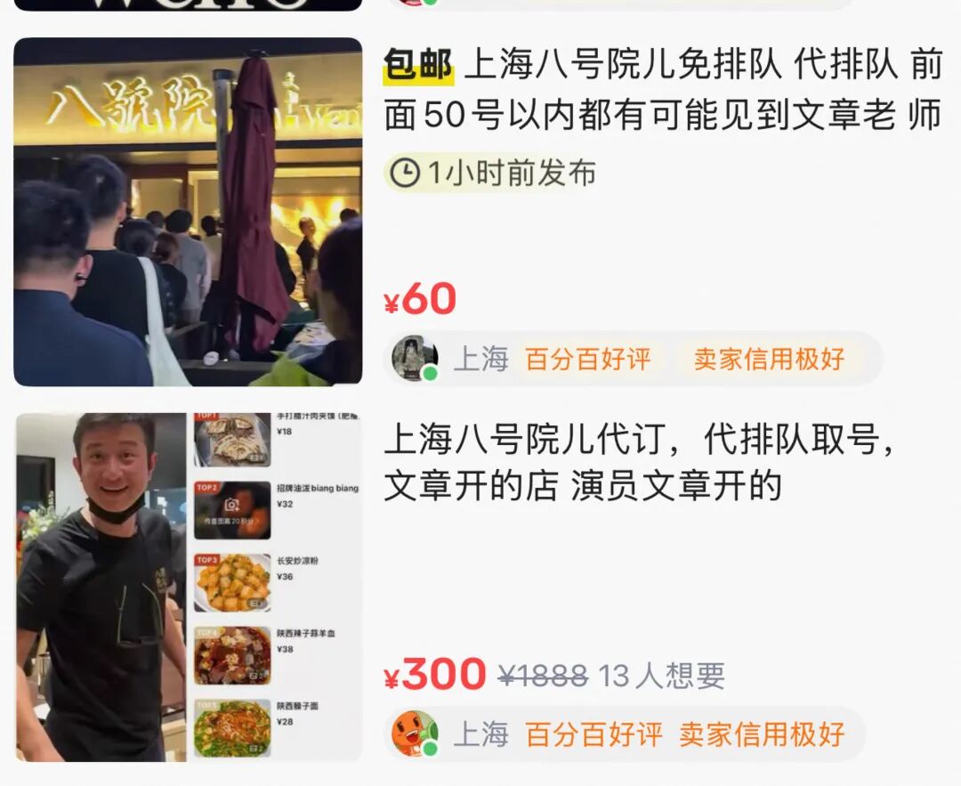 4月8日试营业,“八號院儿”开业不到一周,就登顶大众点评“上海陕菜热门榜”第一,连着几天挂在热搜上。闲鱼代排队从60元炒到500元,有顾客从浙江嘉善早上7点出发,赶到上海,中午12点还没进店;有人等了7个小时才吃上一碗面。