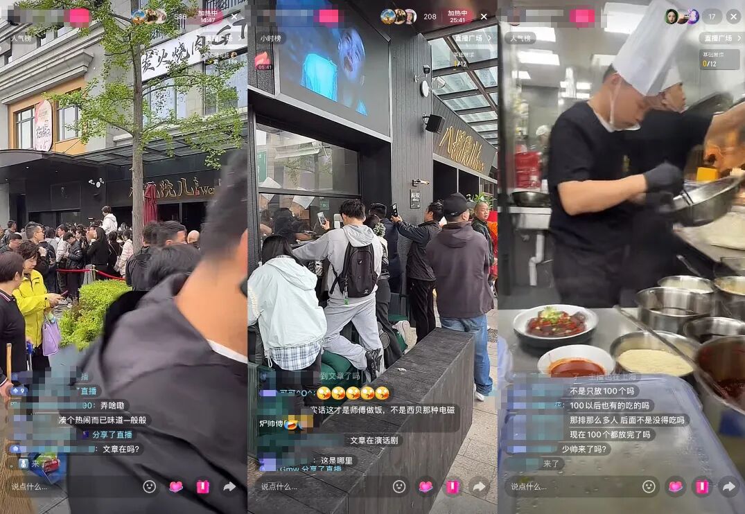 店门外更热闹。一堆主播架着手机直播,弹幕里问得最多的就是“文章何时出现”,部分直播间已有近十万人看过。